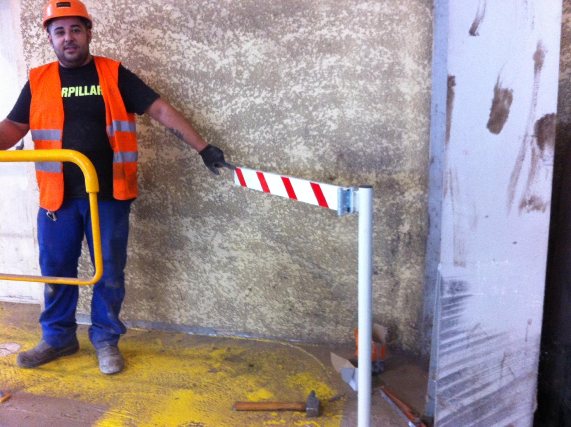 Potence de signalisation. Mise en place de bandes fluorescentes. Platines de fixation au sol.